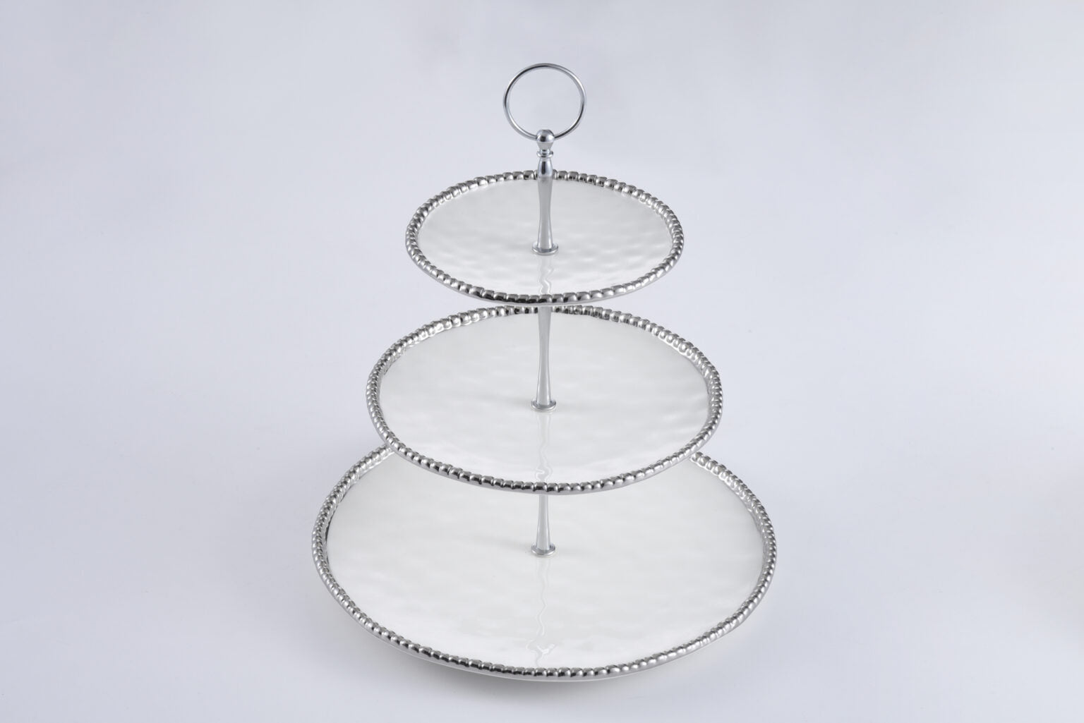 3 Tier Stand in Salerno. Beautifully showcase your desserts, pastries, or small sandwiches on this gorgeous multi-level display. This gorgeous high-fired white porcelain serving piece conveys traditional elegance with graceful silver tone titanium beading. Tarnish free and stain free, you won’t believe it’s NOT metal. Assembly Required
