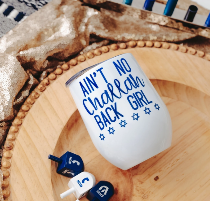 This is an indoor or outdoor wine tumbler to keep your Maneshevitz (personally I prefer Kedem) or arak spiked coffee either hot or cold with your choice of Chanukah and Jewish themed funny phrases.