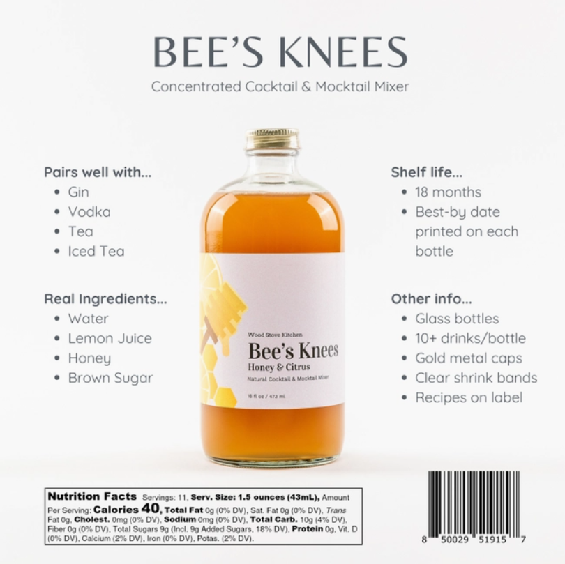 A Bees Knees is a Prohibition Era cocktail made with gin, fresh lemon juice, and honey. Our all-natural citrus-honey Bee's Knees Mixer makes it easy to prepare this drink or to add a splash of flavor to soda water, hot or iced tea, margaritas, or any other beverage. Each 16 fl oz glass bottle makes 10+ drinks. We source our lemons from American citrus groves and our honey from local apiaries in New Hampshire. We love this bright golden mixer, and so will your customers!