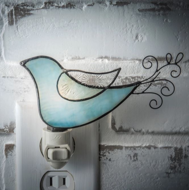 This whimsical bird night light features a textured blue green opalescent stained glass for the body with a clear vintage texture for the wing and wire detailing for the tail feathers. Each stained glass night light is carefully handcrafted by skilled artisans using a copper foil and solder technique developed by Louis Comfort Tiffany in the late 1800’s. This age-old art form combined with 21st century designs creates the perfect combination for unique home décor.