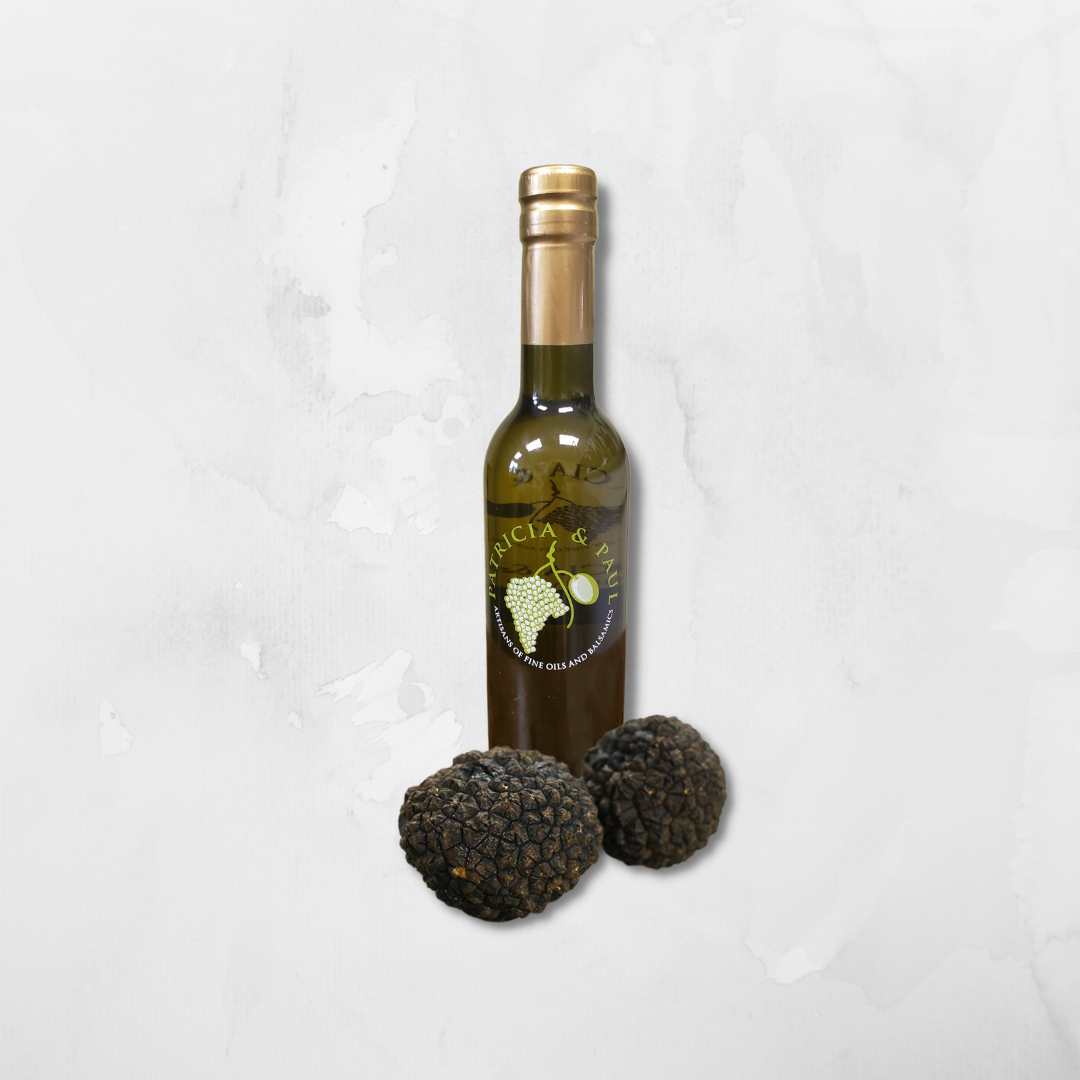 This late fall, early winter true is used in the making of this savory oil. A ‘tea method’ is utilized which steeps the ripe trues for extended periods of time in olive oil. The closely guarded, proprietary process yields our heady, complex Black True oil. No extracts or chemicals are used in its production.