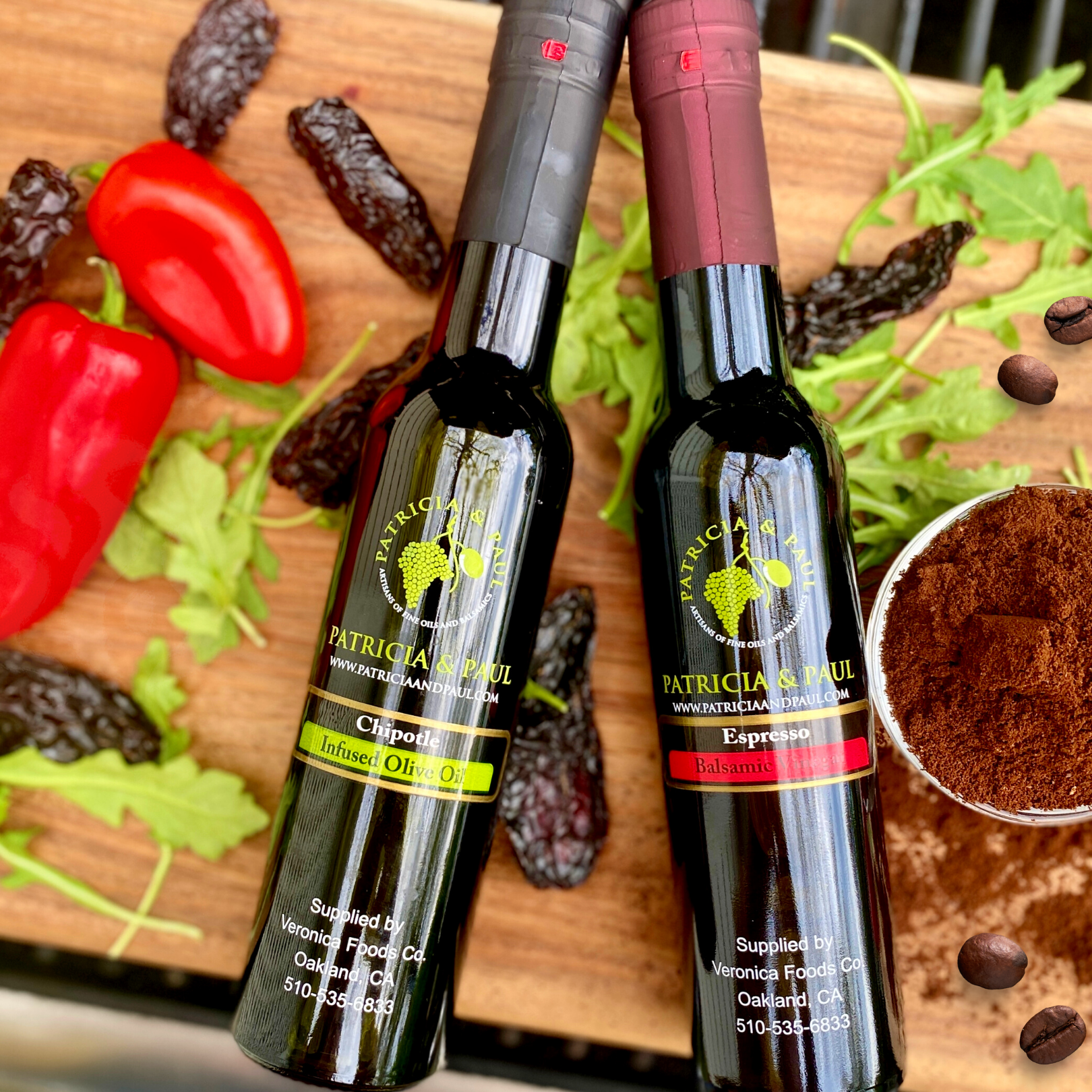 Paired, Chipotle Infused Olive Oil & Espresso Dark Balsamic Vinegar packs a punch as a marinade for steak or mix it into burgers. Saute this combo in a pan with onions, and you have the base for award-winning chili or taco salad. Try it drizzled on burgers, brushed on salmon or steak, and topped with blue cheese. It's a winning combination for grillers and meat lovers.