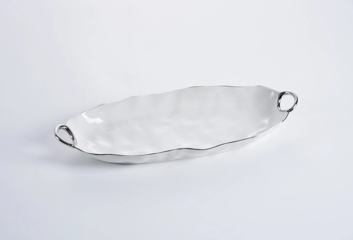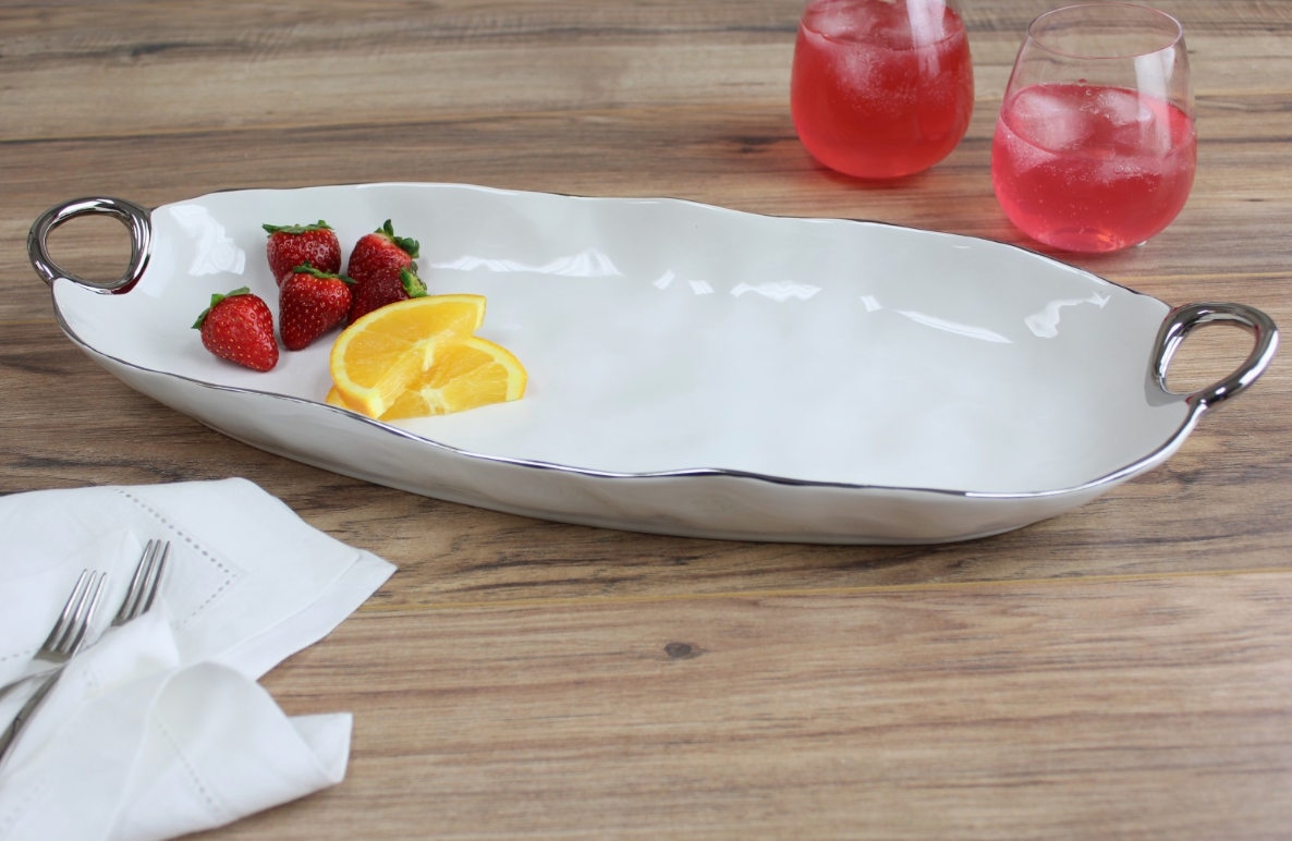 Deep Long Server from our Handle with Style Collection. This platter is great for serving an assortment of freshly sliced breads or a variety of appetizers from stuffed mushrooms to baby lamb chops to yakitori. Asparagus, carrots, green beans, even a whole fish all are stunning on this piece. Gleaming white porcelain with smooth and graceful handles in silver titanium. Food safe. Dishwasher safe. Oven safe to 550°. Easy Care.