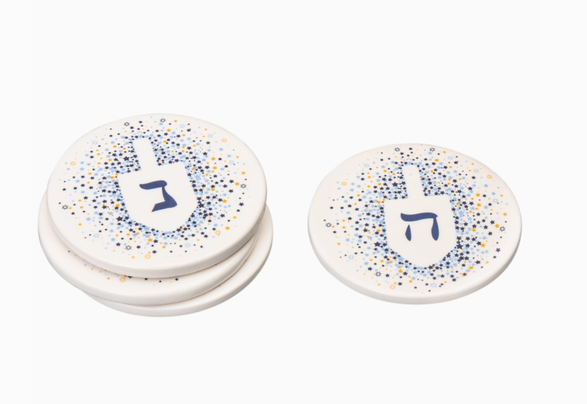 Dreidel Coaster s/4. Godinger brings you a unique set of 4 Dreidel Coasters, crafted from top-quality ceramic. Ideal for use, these coasters are not only functional but also add a touch of elegance to your home decor. They come beautifully packed in a gift box, making them a perfect present for any occasion.
