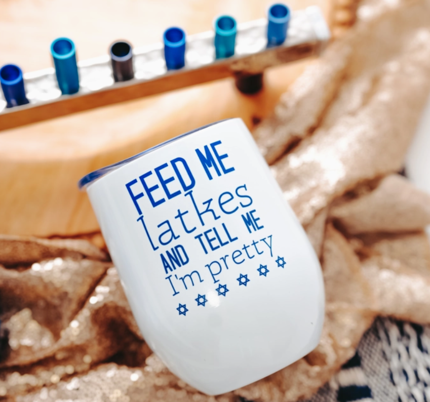 This is an indoor or outdoor wine tumbler to keep your Maneshevitz (personally I prefer Kedem) or arak spiked coffee either hot or cold with your choice of Chanukah and Jewish themed funny phrases.