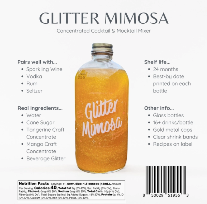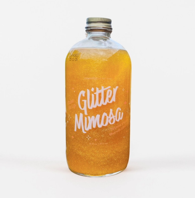 Get your sparkle on with our concentrated, glitter-infused Glitter Mimosa Mixer. It contains tangerine and mango in addition to FDA-approved edible glitter that is made from the mineral mica. There's absolutely zero micro-plastics or anything artificial. Just add 1/2 to 1 ounce of this mixer to a glass of sparkling wine or sparkling juice for a mimosa or "mock-mosa". Or follow our lead and add 1 ounce of this mixer to 1-2 ounces of white rum and a splash of seltzer on top for a fun, tropical cocktail. Each 16 fl oz glass bottle makes 16-32 drinks!