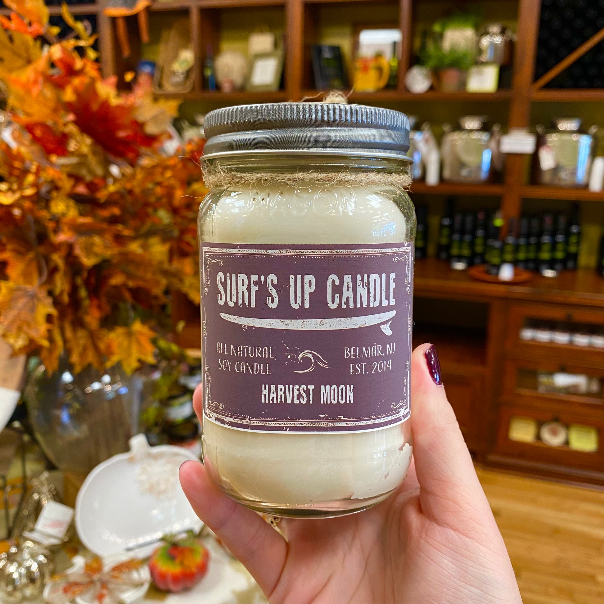 Harvest moon is a true scent for autumn with fresh berries and eucalyptus mixed with spruce, woods, and cedar. Surfs Up Candle are all natural soy wax, no dyes, paraffins, lead or petroleum content. Hand poured in small batches using custom created scents. Feature a paper and cotton wick for clean even burning. 16 oz reusable mason jar burns approx. 80 hours