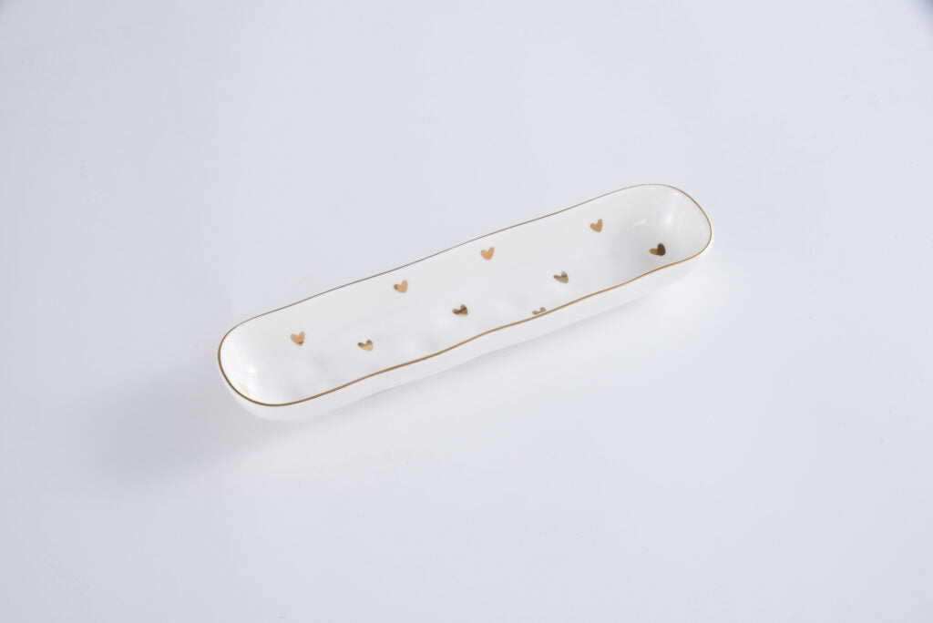 Cookie Tray from our Heart to Heart Collection. Perfect for crackers, small cookies, and other small treats. Gleaming white porcelain with delicate gold-tone decorations. Food safe. Dishwasher safe. Oven safe to 500°. Easy Care.