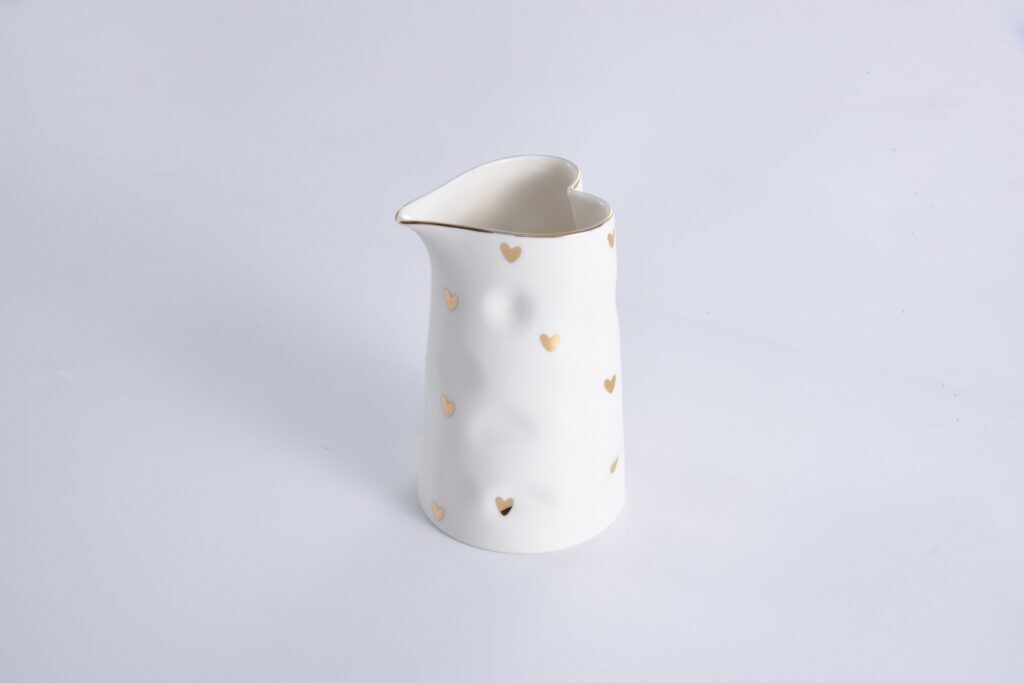 Pitcher/Creamer from our Heart to Heart Collection. The perfect everyday creamer or pitcher designed for relaxed meals with friends and family. Can also be used as a bar pitcher, syrup jug or to serve sauces or dressings on the side. Crafted in a stunning white porcelain with delicate gold-tone decorations. Food safe, dishwasher safe, oven safe to 500°. Easy Care.