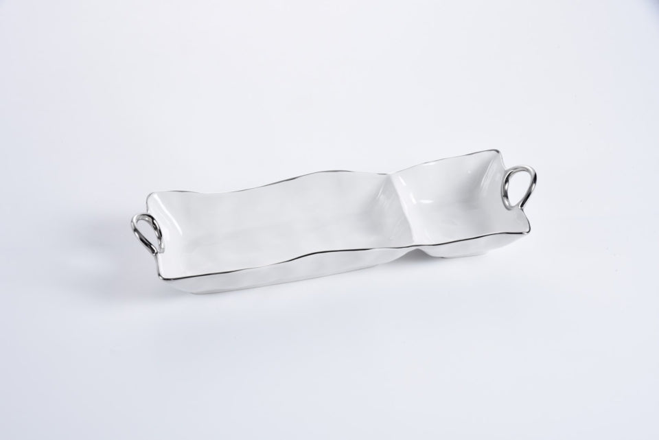Chip and Dip from our Handle with Style Collection. Perfect for any dip combo – hummus and pita, salsa and tortilla chips, veggies and ranch or our favorite berries and whipped cream! This piece also makes a stunning display for sushi and soy sauce or crab cakes and tartar sauce. Gleaming white porcelain with silver finish handles. Food safe, tarnish free, dishwasher safe, oven safe to 550°. Easy Care.