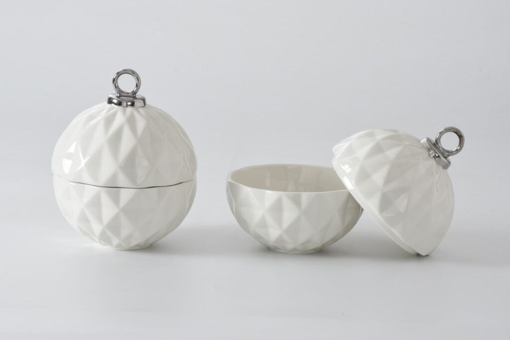 Large Ornament Bowl from our For The Holidays Collection. Great for serving candies, nuts, fruit, or condiments! A festive ornament shaped bowl in stunning and elegant white and silver metallic finished high-fired porcelain. Food safe, Dishwasher safe, Oven safe to 500°. Easy Care.