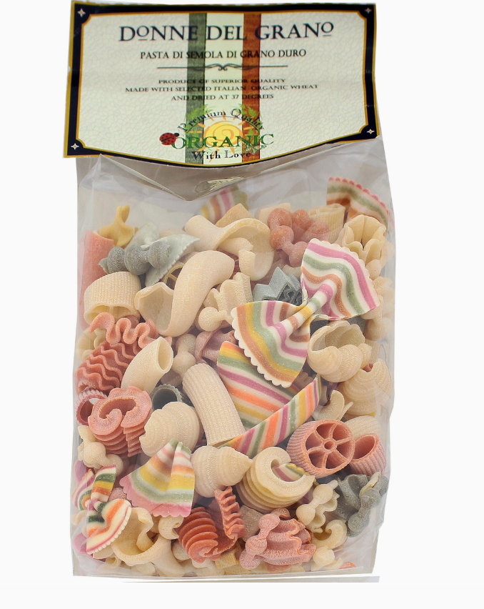 This beautiful colored Monnezza Verdure (Colored Leftovers) pasta from Donne Del Grano, is made from premium durham wheat. The amazing colors all come from natural ingredients: green spinach, golden turmeric, red paprika and beets that all combine to create a fantastic rainbow array of colors. Cooks in 10 minutes to achieve optimum flavor and aroma.