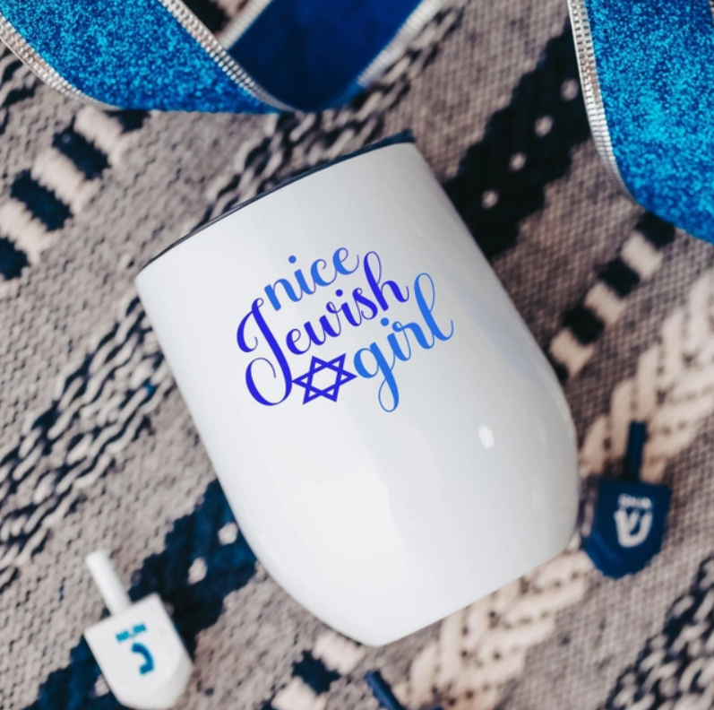 This is an indoor or outdoor wine tumbler to keep your Maneshevitz or arak spiked coffee either hot or cold while you celebrate the Jewish New Year and the Festival of Lights!! And who knows - maybe someone will believe you actually ARE a Nice Jewish Girl (lol, I won't tell them the truth)