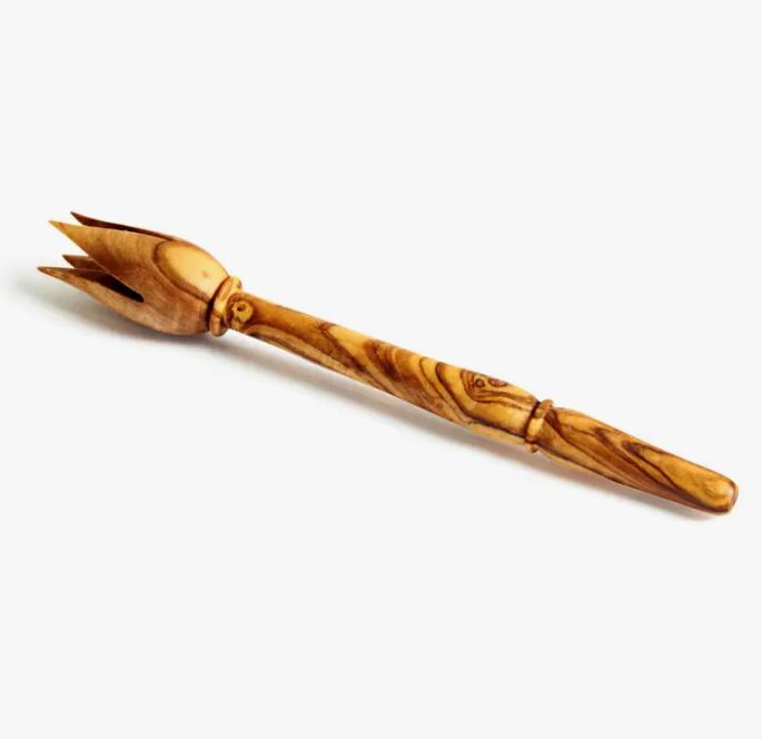 The Olive Picker is a great appetizer fork that allows you to easily pick up olives and other snacks such as cheese, tomatoes and pickles. Olive wood is a hard wood making it very dense and durable for everyday use. Olive wood is nonporous so no germs or odors are retained. All products are made from a single piece of wood—they are seamless and no two pieces are alike.