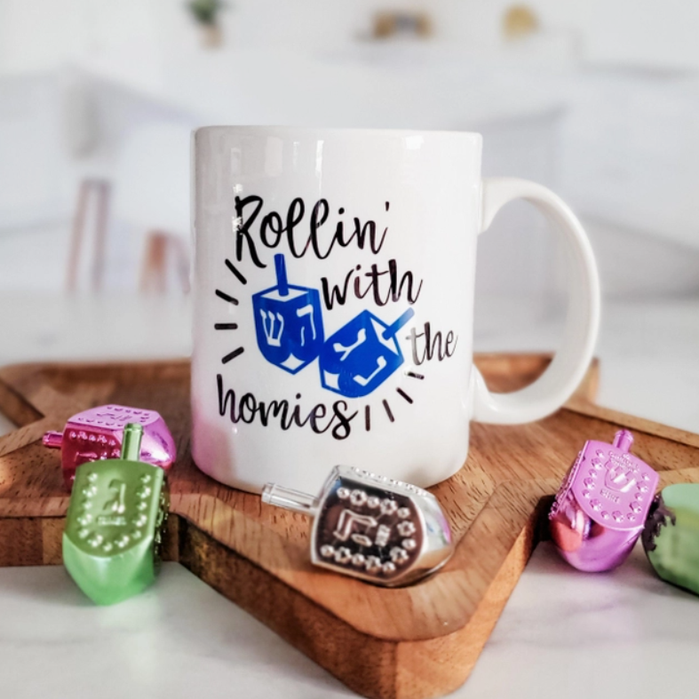 Are you rollin with the homies this Chanukah? Show your Jewish pride and share some puns this Hanukkah with this fun and festive double sided dishwasher safe coffee mug. About the mug: • 11 oz classic ceramic mug • Dishwasher safe • Microwave safe