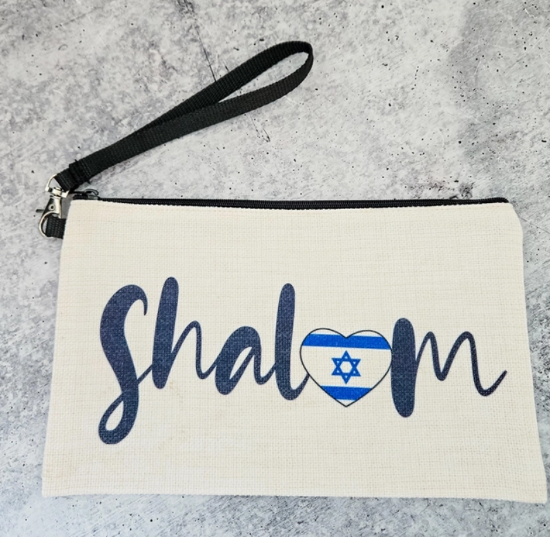 • Reads "Shalom" in navy with an Israeli Flag heart on one side only