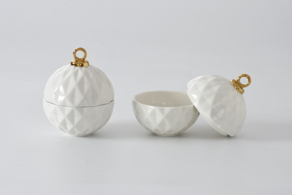 Small Ornament Bowl from our For The Holidays Collection. Great for serving candies, nuts, fruit, or condiments! A festive ornament shaped bowl in stunning and elegant white and gold metallic finished high-fired porcelain. Food safe, Dishwasher safe, Oven