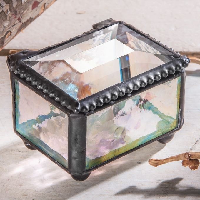 An iridescent glass bottom shimmers and shines in the light to cast brilliant shapes and colors across the tabletop. Perched on round ball feet and trimmed with a beaded edge this small glass box has it all. Perfectly sized for rings, earrings and small jewelry its ideal for girls of all ages. Mini in size and big in style use for an engagement ring presentation or a safe place for rings on the night stand or next to the kitchen sink. This handcrafted stained glass box has been made with lead free solder to protect you and the environment. The metal trim and solder have been stained with an antique charcoal patina and a wax.