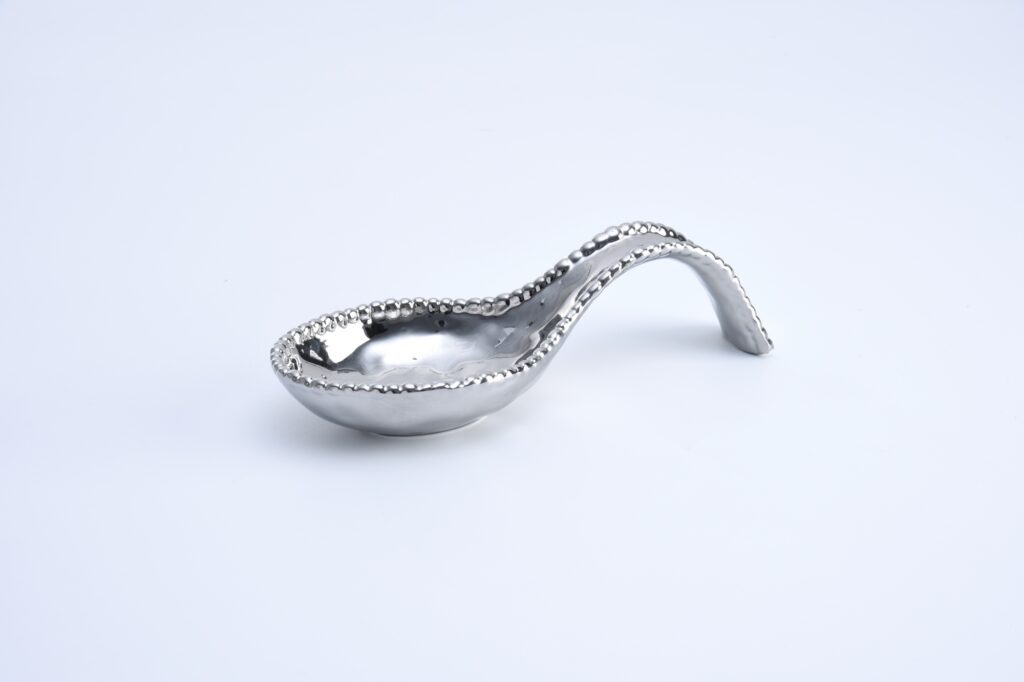 Spoon rest in Verona. Stunning and practical, this is the ultimate dinner accessory. After serving your guests, rest your serving utensils on the spoon rest with no fuss or mess. Striking and effortlessly classy, this is a must have item for any dinner party. Also great for buffets and for the cook who likes to keep a tidy kitchen. Striking and elegant titanium finished high-fired porcelain. Food safe, dishwasher safe, oven safe to 500°. Tarnish and stain-free. Easy Care.