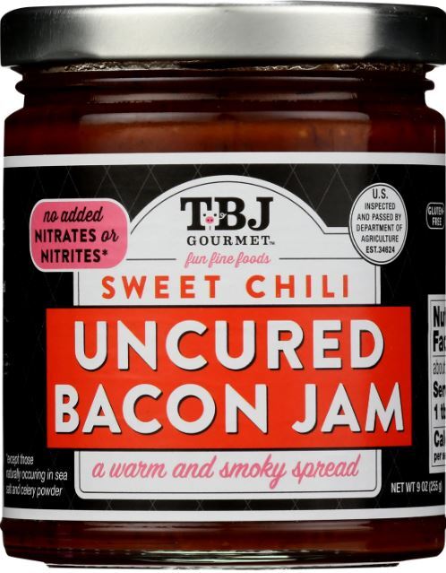TBJ Gourmet Sweet Chili Uncured Bacon Jam is our original, authentic & time-honored recipe of sweet-and-savory bacon goodness with a warm and smokey twist; A taste match made in bacon heaven. Pairs with roasted meats and used as a glaze on wings or sear scallops. USDA certified like all REAL bacon jam.