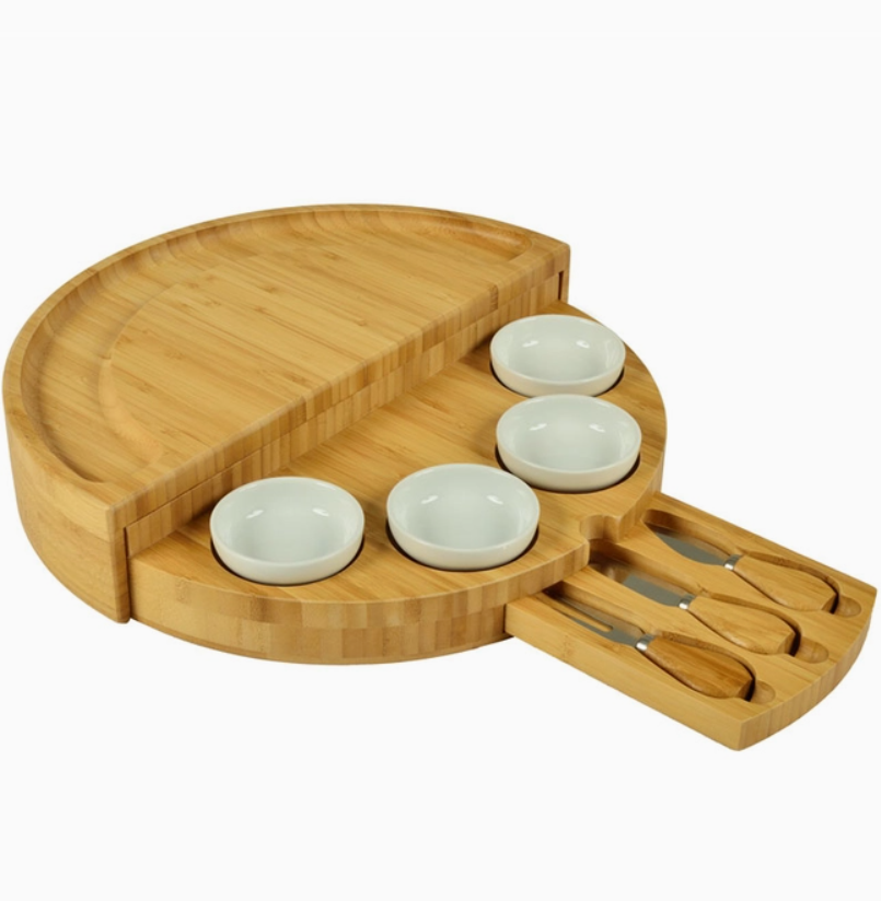 An Ascot original and exclusive, (U.S. Patent Nos. D925,997 S) the Tapas Rotating Cheese Set is a Bamboo Board that amazingly transforms from a half circle to a circular, multi level cheese board with three stainless steel tools in a pull out drawer. This ingenious high quality board will impress guests when entertaining, and carry your brand name for years. A unique and very special upscale gift.