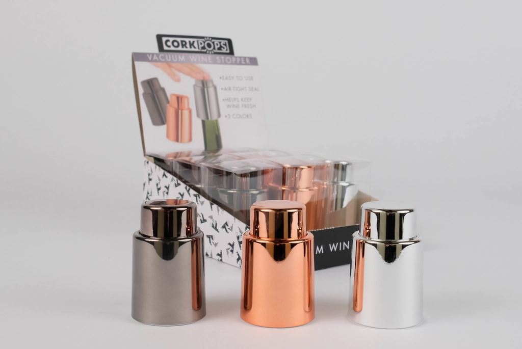 The perfect gift for any wine drinker! Simple air retraction system helps preserve the freshness of any bottle. Let the wine you savor keep its flavor! Available in three metallic colors. Free counter display included! Whether it's White Red or Rosé, say Hurray to the vacuum wine stopper that keeps wine as fresh as on the vine! Makes a great gift.