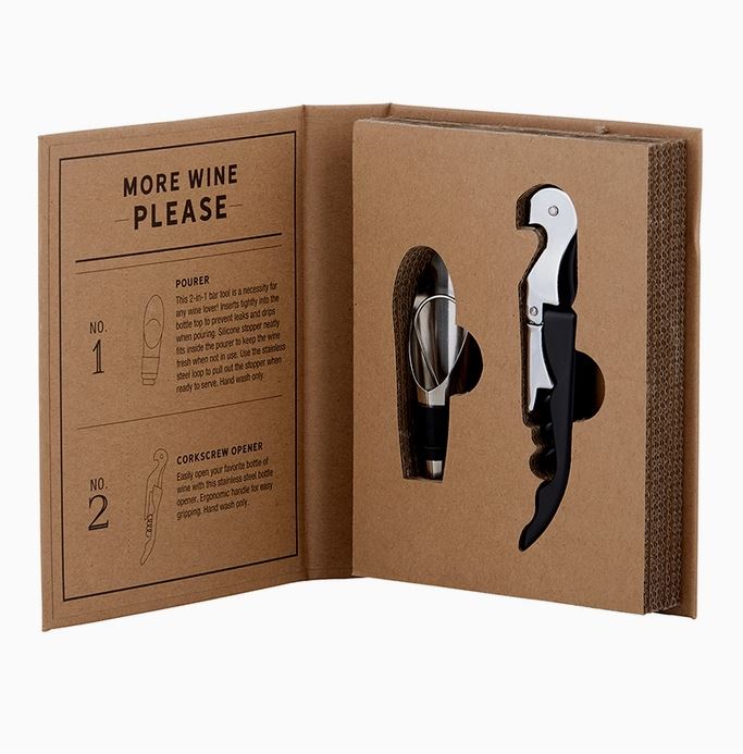 The perfect gift for any wine-o! · Gift Packaged for easy gifting · Open your wine with ease with the help of these stainless steel tools · Add some cheese and a marble board to complete the perfect hostess gift! · Material: Stainless Steel, Silicone, Cardboard Box · Size: Box - 4.5" W x 6.25" H x 1" D / Pourer - 0.80" W x 3" H / Opener - 1" W x 4.75" H · Care Instructions: Hand Wash Only